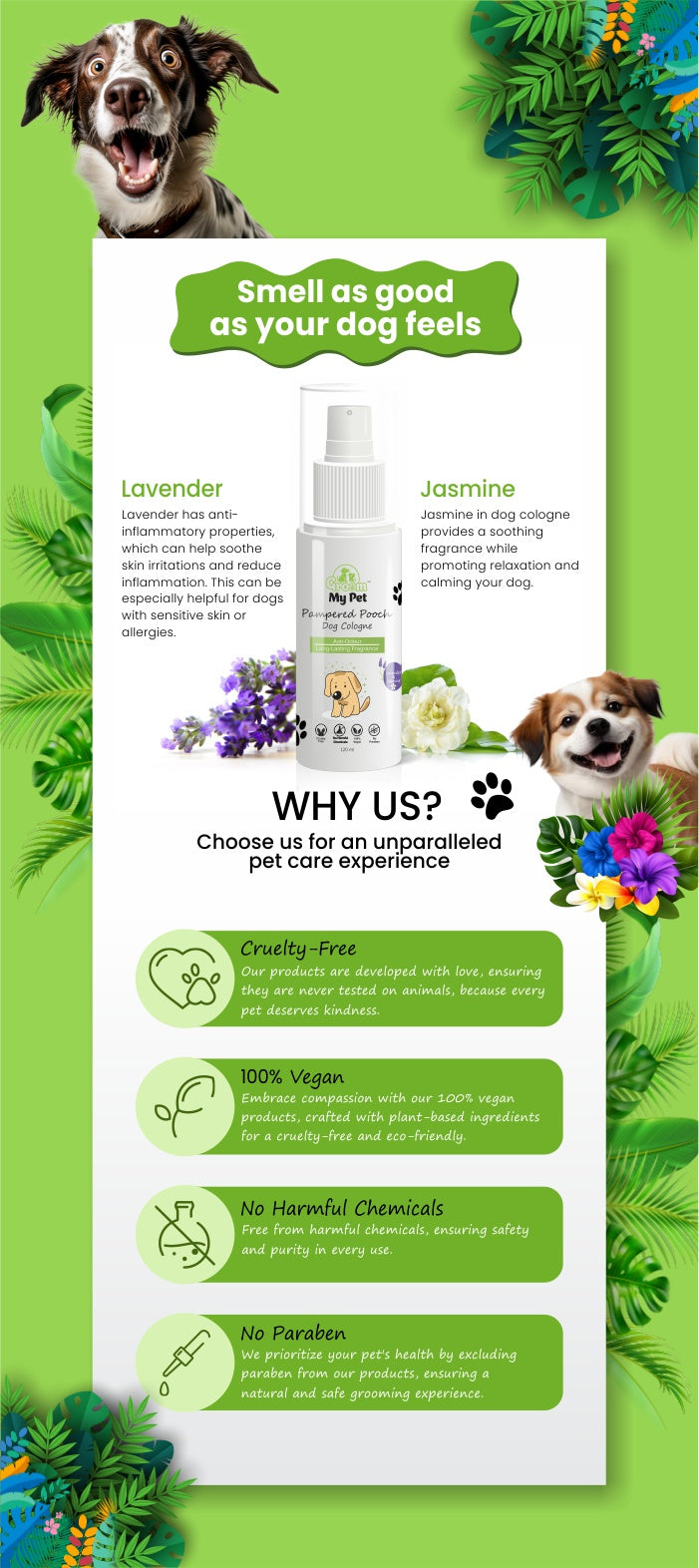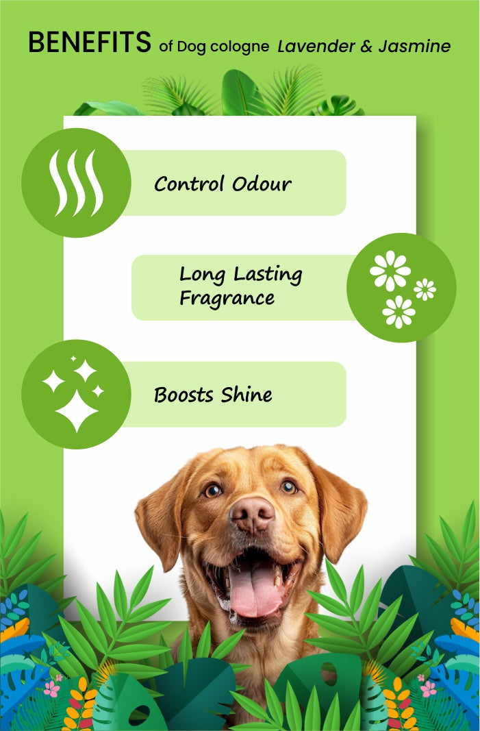 This dog cologne is simply heavenly! The fragrance of lavender and jasmine scent is incredibly soothing, and it lasts for days. I've received so many compliments on how great my dog smells since I started using this cologne. I'll definitely be repurchasing!"